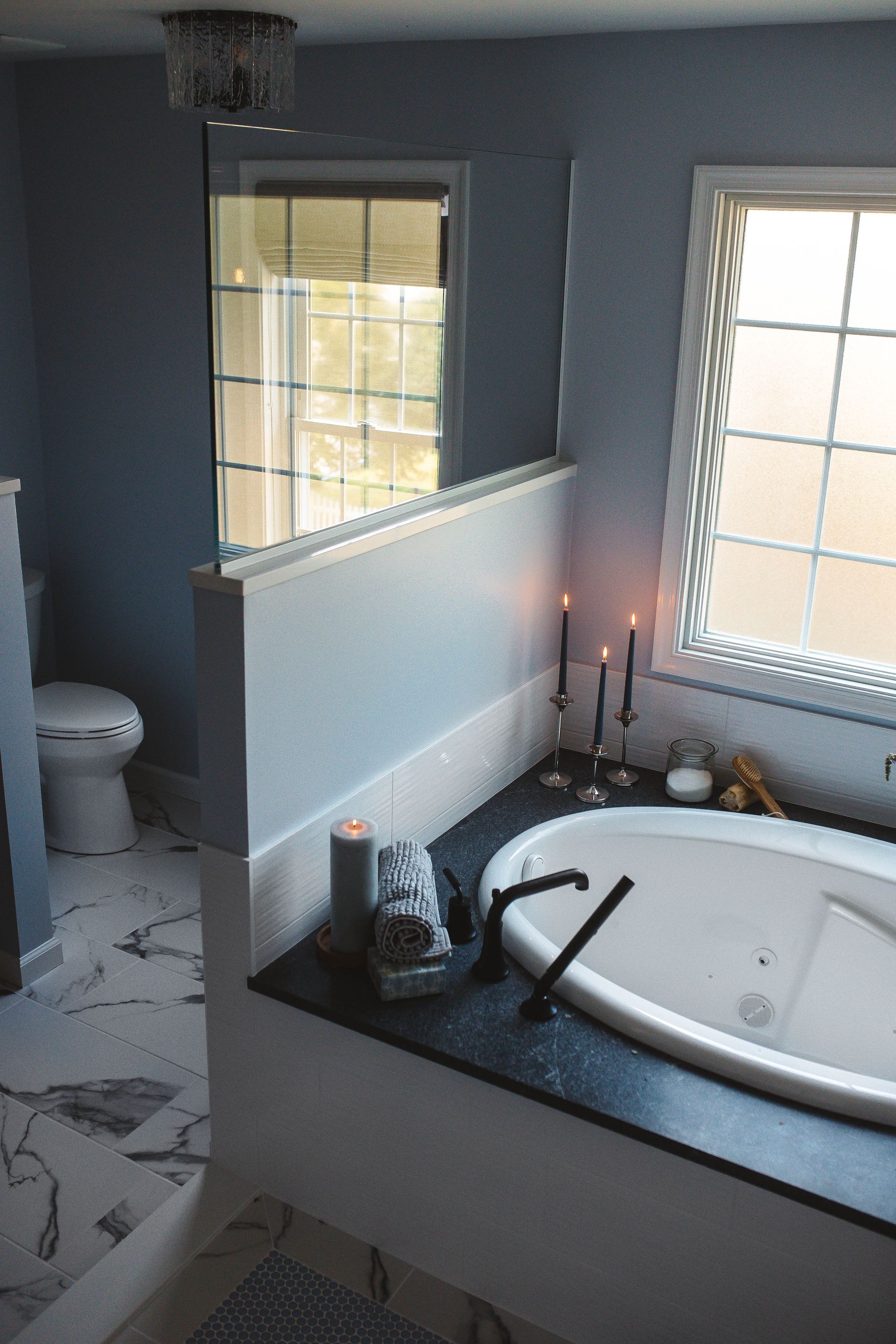 This bright, clean bathroom we designed features a modern wet room layout, emphasizing an open and airy feel. Glass half-walls subtly separate the water closet without interrupting the flow of light, creating a seamless transition throughout the space. The glass accents, paired with sleek fixtures, allow the natural light to reflect and brighten every corner. The wet room itself offers both functionality and style, with the elegant flooring and expansive bench. This bathroom exudes a spa-like tranquility, with the thoughtful design blending practicality and luxury.